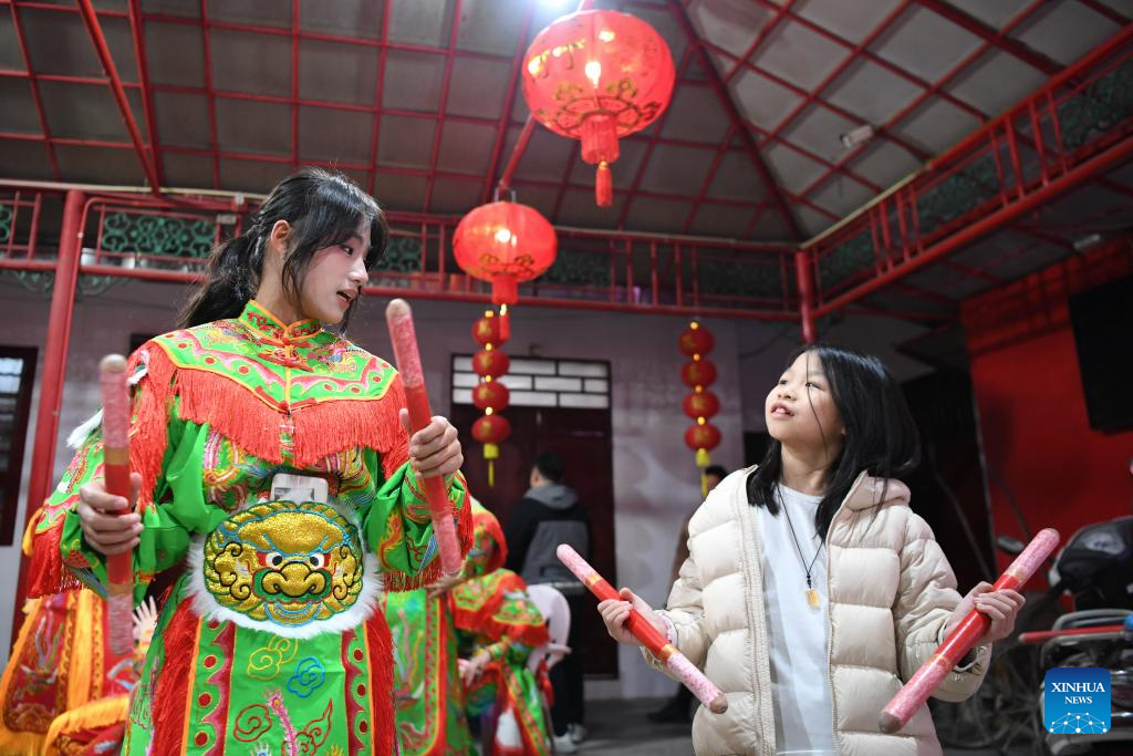 A member of an Yingge dance troupe demonstrates dance movements to a girl in Chaoyang District of Shantou City, south China's Guangdong Province, Jan. 20, 2025. (Xinhua/Deng Hua)