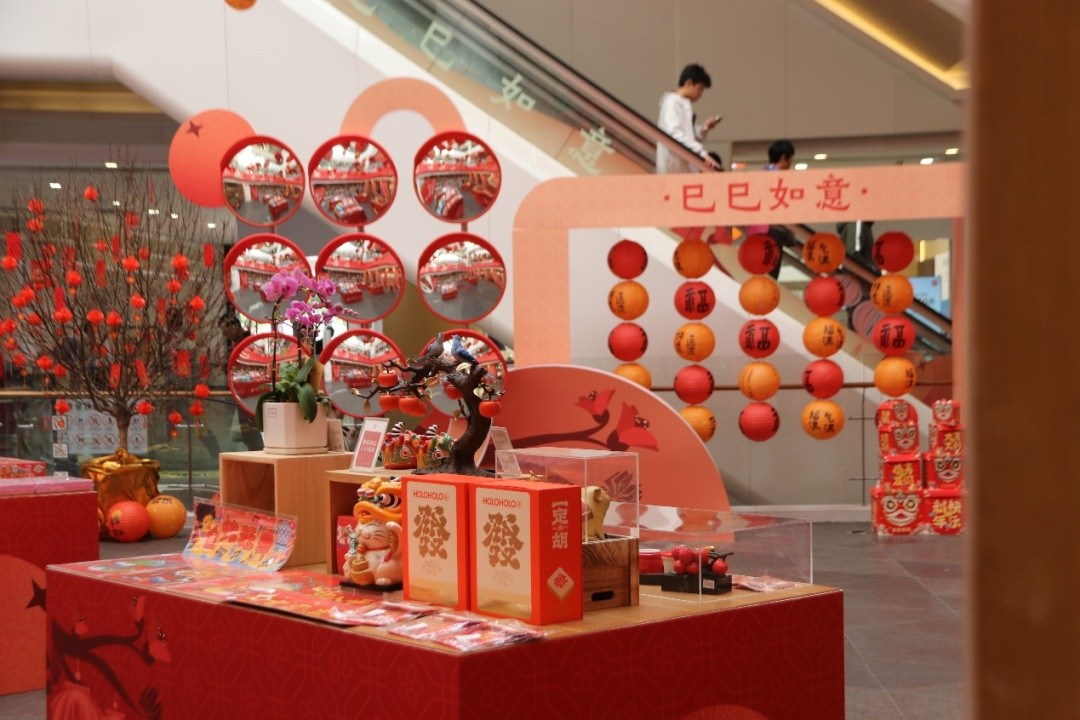 为了营造更加浓厚的节日氛围,门店还特意设置了新春打卡装置。哈哈镜与红色灯笼的结合,既保留了传统春节的喜庆元素,又融入了现代科技的趣味性,让人忍俊不禁。市民游客们纷纷驻足,在这独特的装置前摆出各种姿势,记录下这喜庆而有趣的瞬间,留下新春的美好回忆。此外,门店内的商品也进行了精心的陈列和布置。各种新春主题的文创产品、年货礼盒等摆满了货架,让顾客在选购商品的同时,也能感受到节日的喜悦。