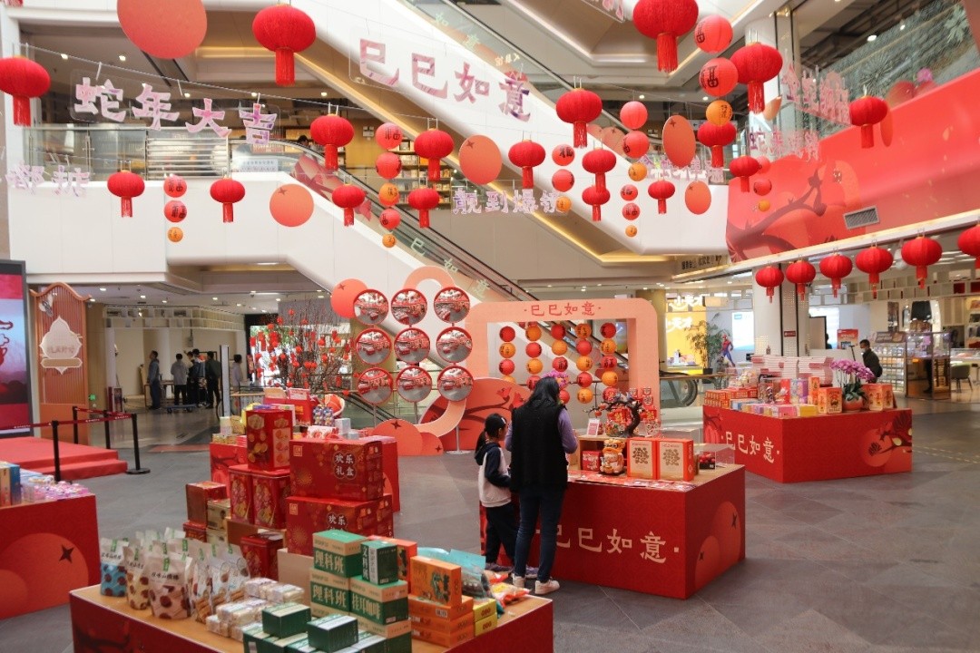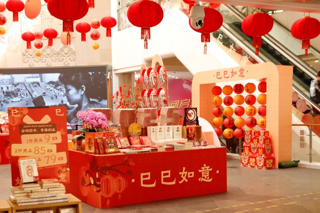 为迎接春节,广州新华发行旗下门店都披上了节日的盛装。走进广州新华发行有限公司的门店,首先映入眼帘的便是火红一片的橱窗。橱窗内,红色灯笼高高挂起,“巳巳如意”“蛇年大吉”“万事胜意”等一众祝福词语与之相映成趣,红彤彤的柿子造型装饰品点缀其间,寓意着新的一年事事如意、红红火火。而门店内,一楼大堂悬挂着“蛇年大吉”“靓到爆镜”等镭射字牌,闪烁着现代与传统的交融之光。