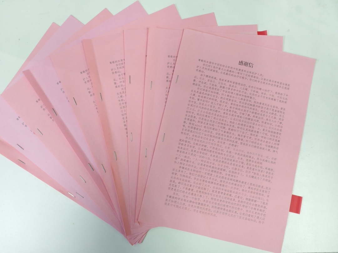 王老师非常用心地将感谢信制作了九份,并根据每一份上不同的侧重表扬的点,送到不同的医护人员手中,让每一个为她和她父母的治疗付出辛勤劳动的医护人员都感受到她和家人发自肺腑的感谢。
