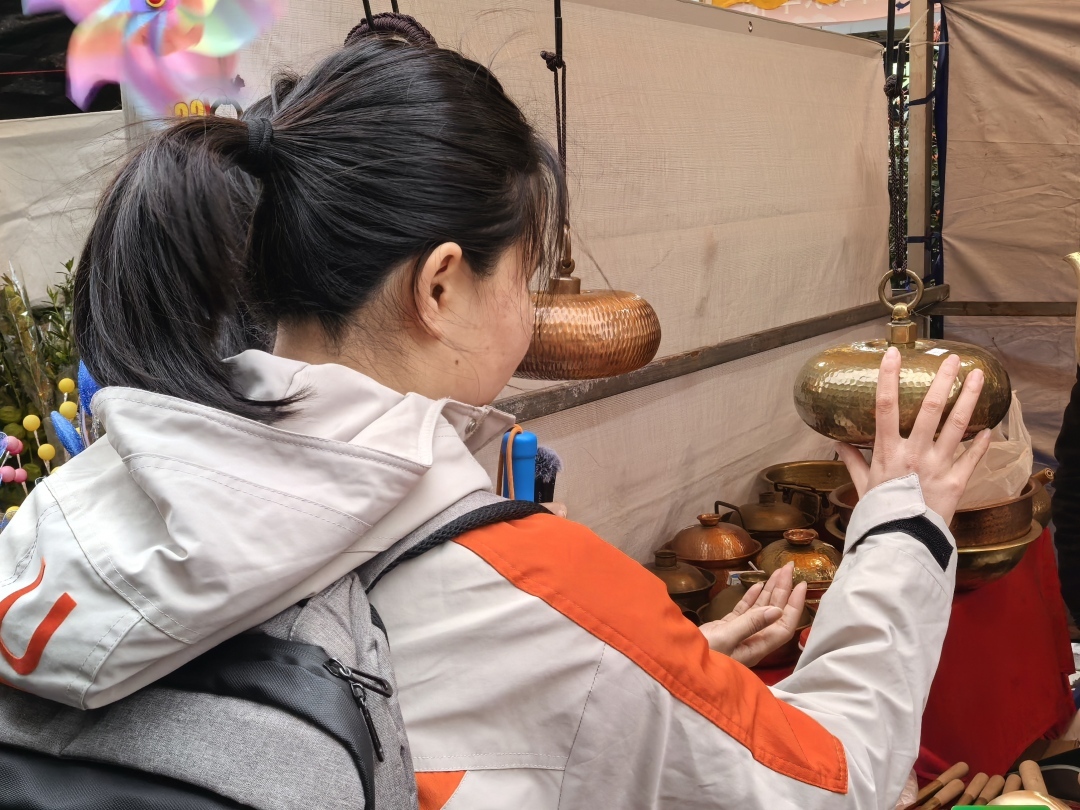 今年的荔湾花市创新采用巨型双花篮替代传统牌楼。以非遗彩灯轧制技术制作的庆典花篮,融入了蛇年、牡丹花、祥云、丰收祈愿等元素。口述员以双花篮为起点,帮助视障人士多感官畅游、全方位感受花市。在关于桃花、蝴蝶兰、杜鹃等多种传统年花的形状、颜色和纹理等描述中,视障人士“听”见了浓浓的年味。在岭南风情满满的手工艺档位,口述员引导视障人士用手“摸”出非遗工艺的精微和匠心。在美食区,视障人士穿梭在多个摊位之间“寻味”,在口述员的解说中了解老西关濑粉、白切鸡、叉烧包等经典招牌菜的发源历史及制作工艺,“尝”到地道风味。在花市出口,志愿者为视障人士送上了福字斗方和活动纪念品,与视障人士一起祈春纳福,祝愿蛇年福气满满。