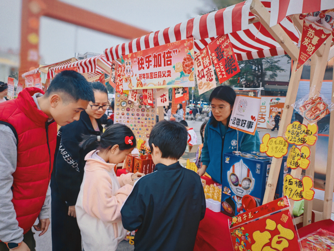舞台另一侧,年货、玩具、福字拓印、残疾人士制作手工品等充满年味的义卖摊位亮相,群众在近百名志愿者的带领下积极参与,当晚共筹得善款4000多元。此外,现场超过400名居民参与了“集五福”游戏互动,大家通过“吸福气”“铲金币”“锣鼓声声”等游戏体验,集齐福气印章,抽取幸运礼品。