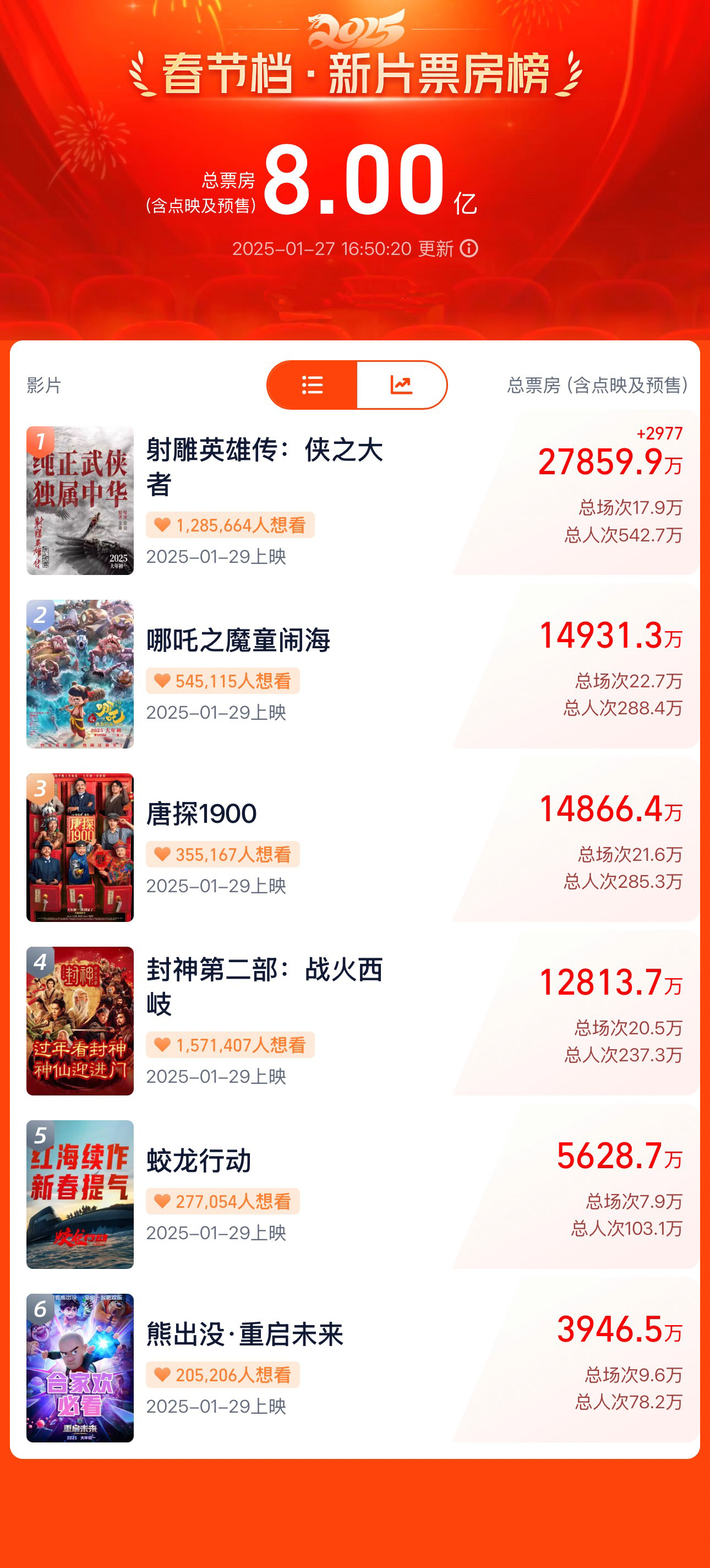 破!八!亿!啦!据网络平台数据,截至1月27日16时48分。2025年春节档(1月28日-2月4日),新片预售票房突破8亿。
