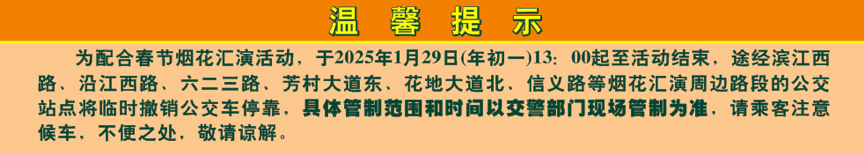 2025年春节烟花汇演将于1月29日(年初一)在白鹅潭江面举行,27日,记者了解到,根据上级交通主管部门的通知要求,为做好烟花汇演期间道路交通管制,交通站场中心下属公交站场管理公司对途经烟花汇演路段的公交线路进行临时调整服务保障工作。