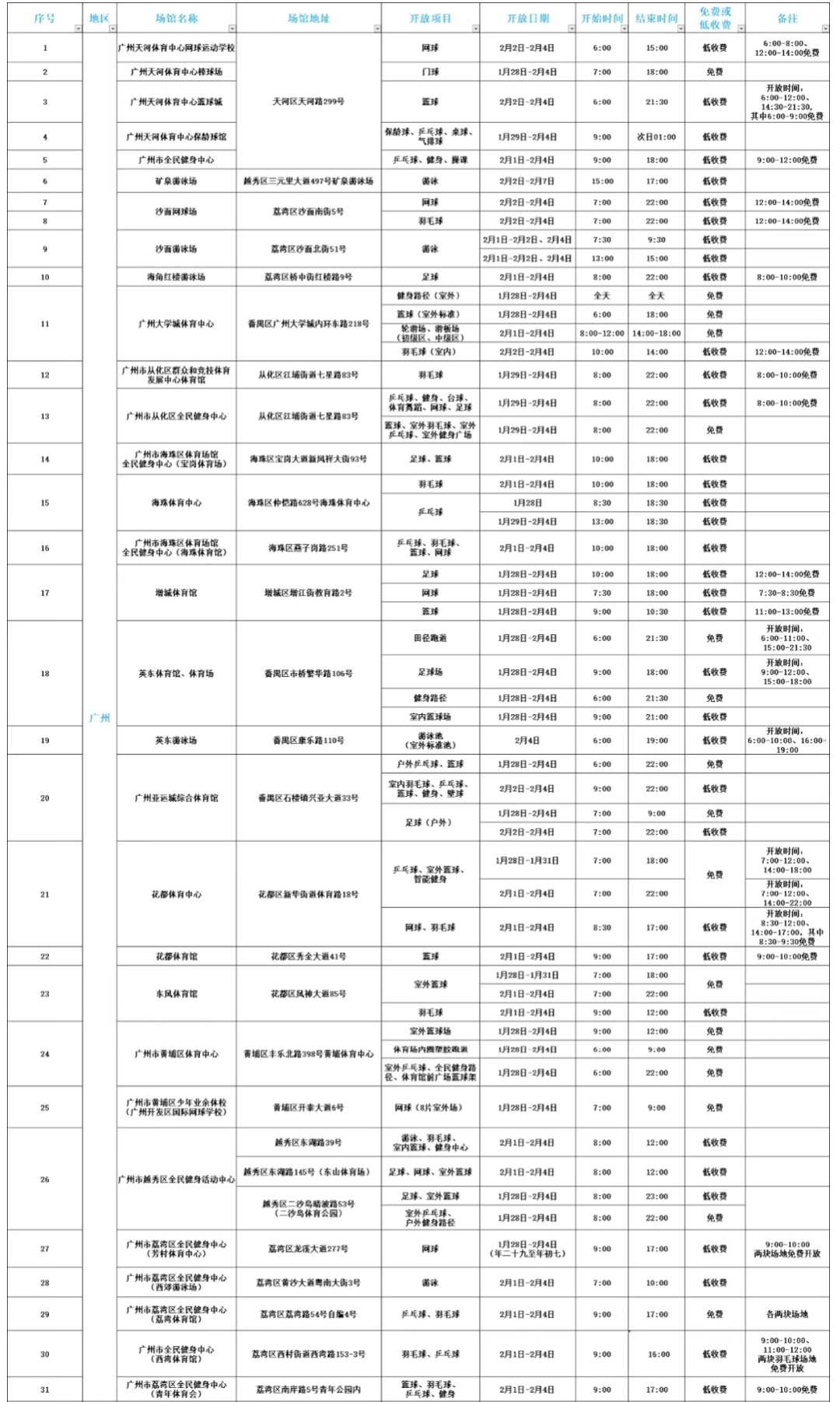 上图为广州部分公共体育场馆的信息,更多信息可点击下面文件,具体开放安排以当地实际为准。