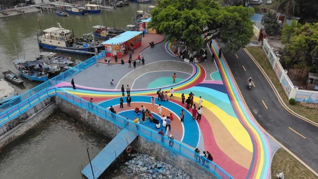 灯光点亮的另一侧,港湾街道蒲洲渔港近日已完成改造升级,美丽的墙绘、花灯、“彩虹路”与碧海蓝天交相辉映,共同构成一幅波澜壮阔的海景图,成为南沙湾又一处超浪漫的地标景观。