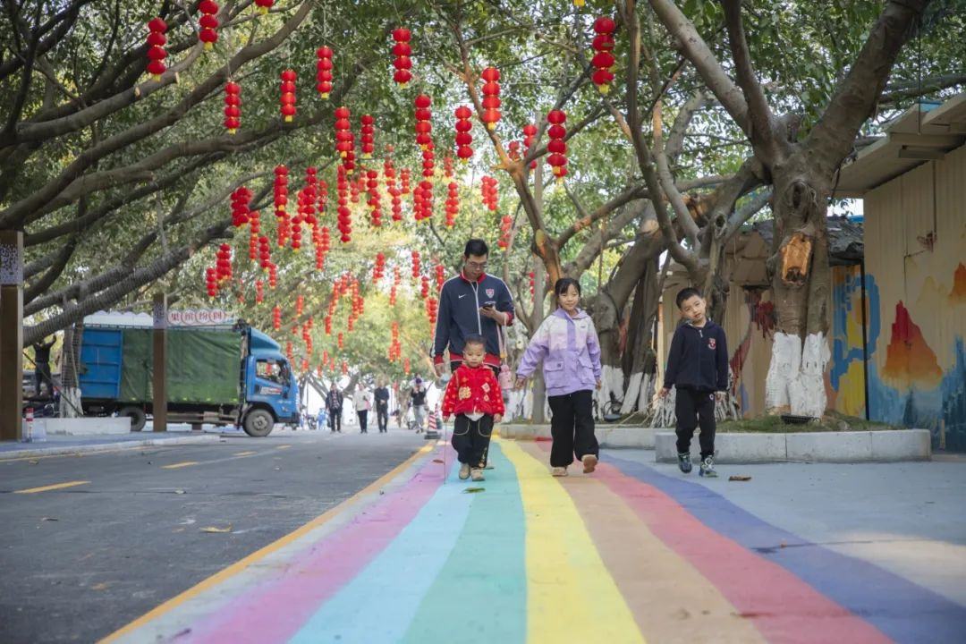 人行步道以彩虹为设计元素,绘制出“彩虹路”;对21间渔民工具房和墙面进行翻新设计和文旅特色彩绘,融入舞狮、渔港人家等文化特色,提升了渔港的文化品位。国风墙绘栩栩如生,增添了新春的喜庆氛围,渔民故事墙绘则讲述了他们出海捕鱼的经历。居民王女士表示,她会带孩子来这里散步,“看到这些生动的彩绘,心情变得很好,还能了解渔港的故事,我觉得很有意义。”