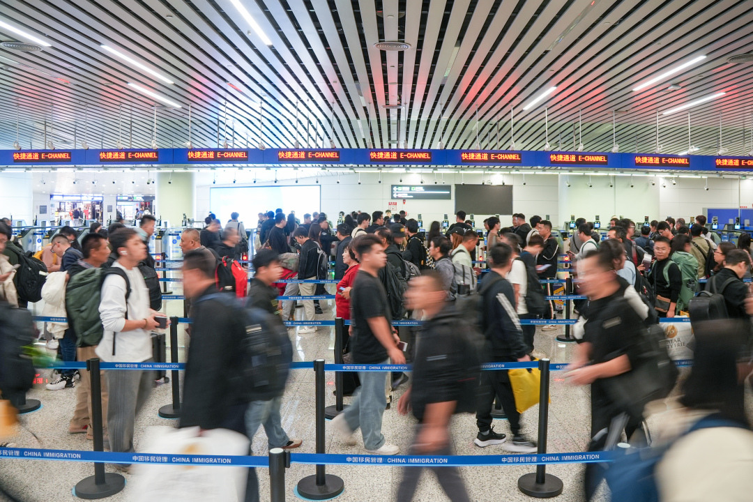 在快捷通道前,老民警王树才换下了年轻人,继续指引旅客有序通关。他半辈子守在国门,是队里的“老大哥”。今年,他又主动放弃调休机会,选择坚守在国门前。