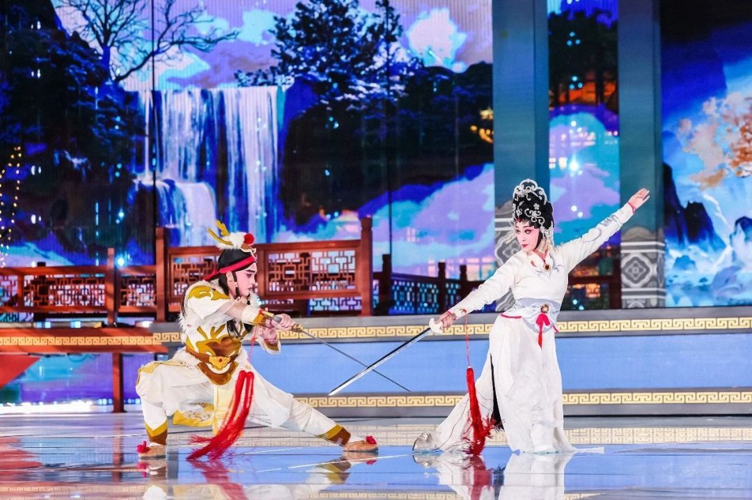 其中的粤剧部分,由广东粤剧院青年演员谭清怡、苏美琪带来新编粤剧《白蛇传·情》中的“趁好天时”选段。朗朗上口、旋律轻快的唱段,唯美浪漫、清新柔美的风格,引发观众鼓掌合拍。两位粤剧演员与小品演员默契互动,充分展现了粤剧的魅力,青春气息扑面而来。