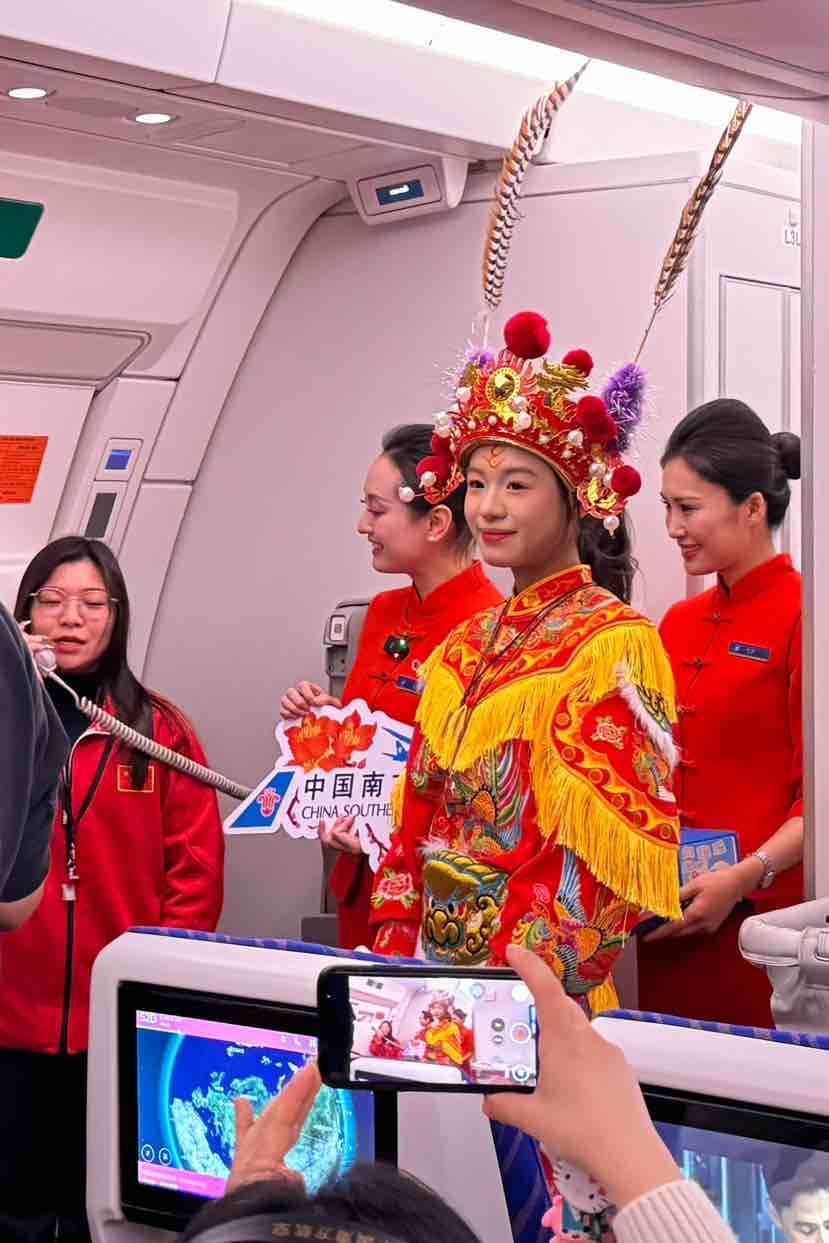 “今天的除夕航班意义非凡,我们见证了英歌舞的‘出海’,并为之贡献了一份力量。期待有更多非遗通过南航的航班传播到世界各地,在海外‘火出圈’!”航班主任乘务长苏萍说。