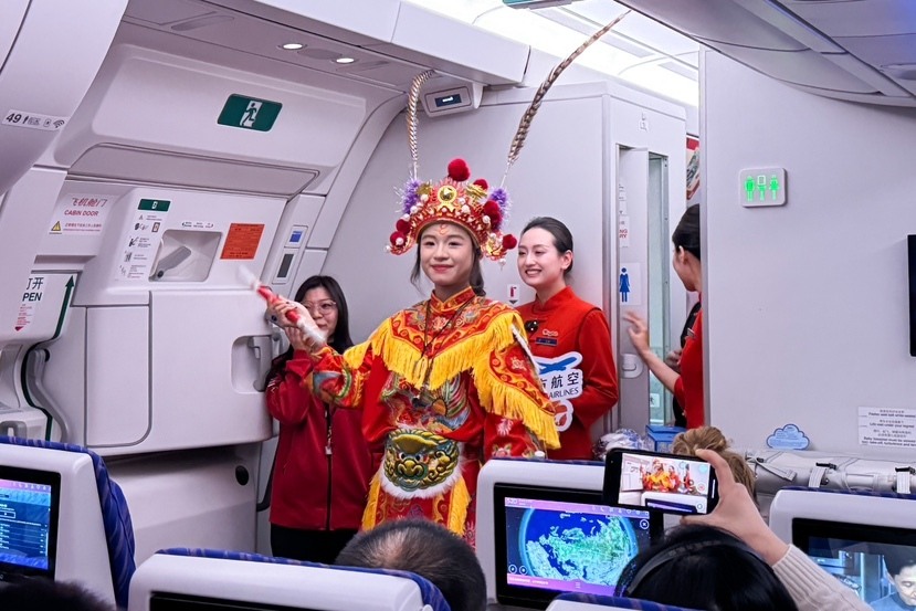 1月28日除夕当天,中国南方航空在由广州飞往德国法兰克福的CZ331航班上举办空中新春联欢会,乘务组精心准备春节诗词接龙、贺年歌曲联唱等互动环节,与中外旅客在飞机上共度除夕、迎接新年。航班中还有一群神秘嘉宾亮相,他们是汕头潮阳西门英歌队的队员们,通过现场展示传统非遗“英歌舞”的风采,让旅客们在惊喜之余大饱眼福。