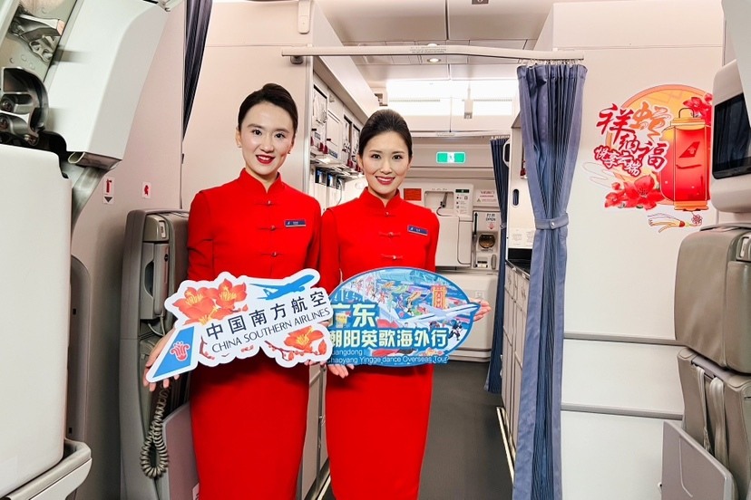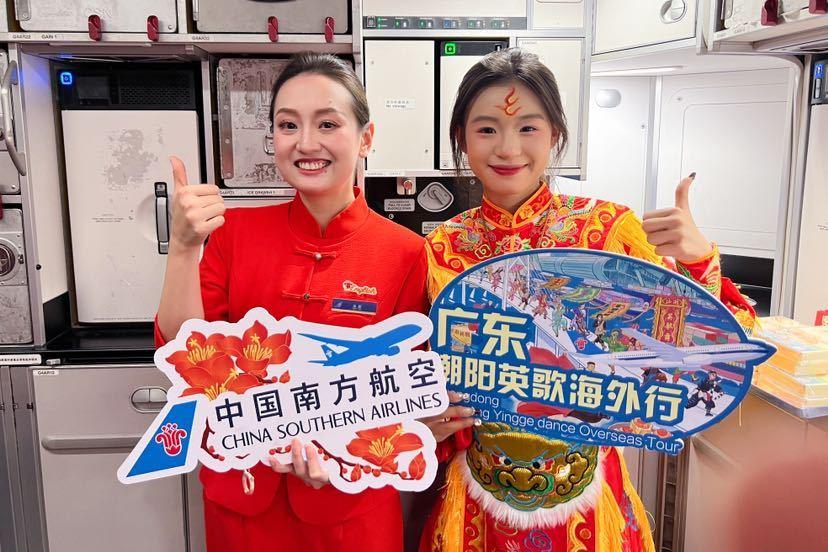 作为三大国有骨干航空运输集团之一,南航扛起央企责任,致力于通过航班传播中华优秀传统文化,打造空中“文化客厅”。2024年以来,南航已服务保障普宁富美英歌队、普宁南山英歌队、潮阳金浦英歌队等6支潮汕英歌队走出广东、走向世界,持续燃动海内外观众,并联合英歌队以空中主题航班为载体举办“云上非遗”科普活动,让中华战舞“舞”上云霄。