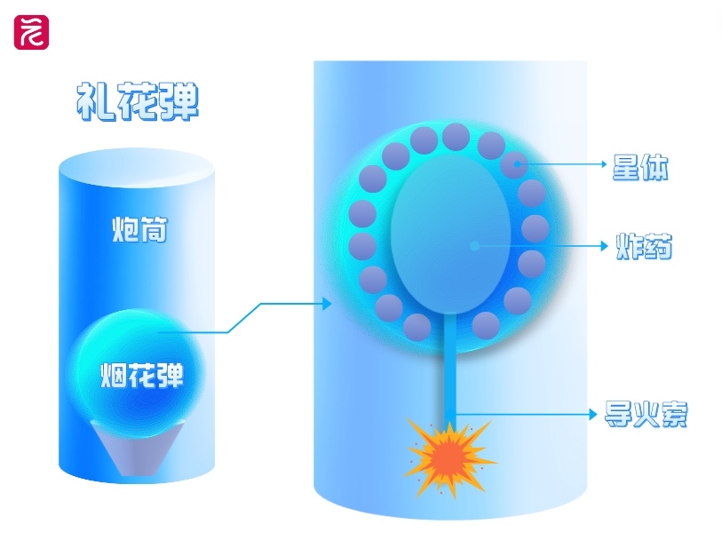 从地面出发到完成空中美的绽放,高空烟花至少需要经历两次爆炸,第一次爆炸把烟花弹送上天,第二次爆炸把烟花弹的弹丸炸开,呈现出亮光和色彩。