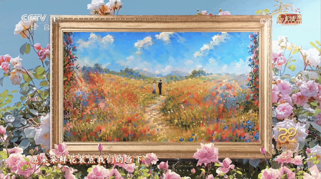 此外,阿里云通义AIGC技术首次大规模应用于节目画面。在《在岁月里的花》节目尾声,舞台画面被瞬间转化为静态油画,虚实交融的视觉效果令人叹为观止。阿里云还为舞台设计提供了风格迁移、参考图生成等技术支持,进一步推动了节目创新。