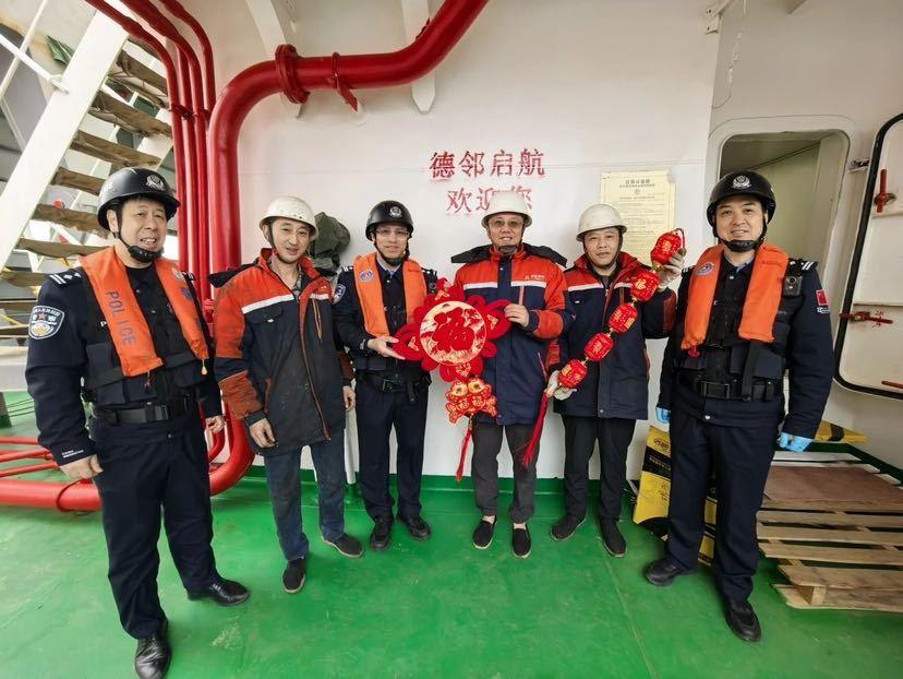图为黄埔边检站民警为船员送“福”。