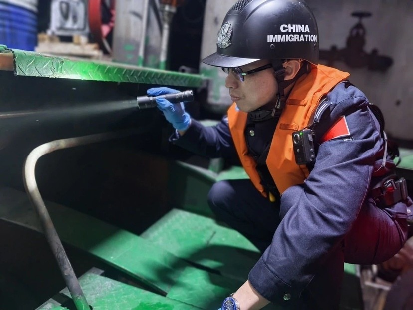 图为黄埔边检站民警对船舱进行检查。