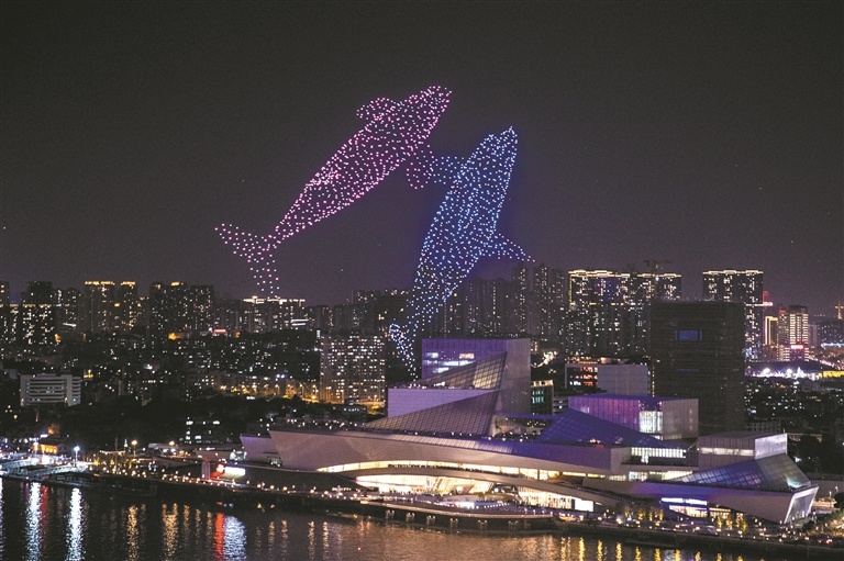 紧接着,“第三篇章:梦汇羊城智领湾区——银鹰展翅创新质”炫起了科技感。高空的宇宙造型礼花,低空的蝴蝶、蓝紫星光点缀,拉开了科技感十足的烟花篇章。在这一篇章里,高空与中低空烟花的融合展现得淋漓尽致,高空多重光环、低空多彩变色花束,高空爆裂椰树、低空金色蝴蝶等组合出现,每一次布满夜空的绽放,都如同蒸蒸日上的生活,象征着广州不断追求卓越、勇攀高峰的精神。