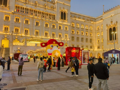 作为横琴的“老牌”网红打卡点,励骏庞都广场悄然换上春节新装,给充满葡式风情的建筑增添了浓厚的新春氛围。春节期间,广场共设置六大打卡点,邀请游客跟随憨态可掬的“蛇宝”一起迎接新年好运。