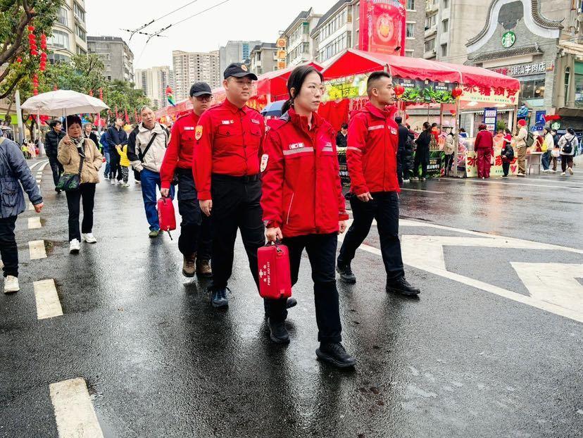 与之并肩作战的众行应急救援服务队同样不遑多让。作为战略合作单位,他们深知责任重大,提前部署,组织起一支训练有素的志愿者小分队。队员们身着专业救援装备,在花市周边展开严密巡防。从主干道到小巷子,从人群密集区到摊位集中地,全方位无死角覆盖。一旦发现有拥堵、推搡等安全隐患,立即上前疏导;遇到有人身体不适或轻微受伤,迅速拿出急救包进行简单处理,第一时间保障市民的人身安全。他们眼神坚定、行动果敢,成为花市安全最坚实的守护者,让市民可以安心赏玩,无惧突发状况干扰。