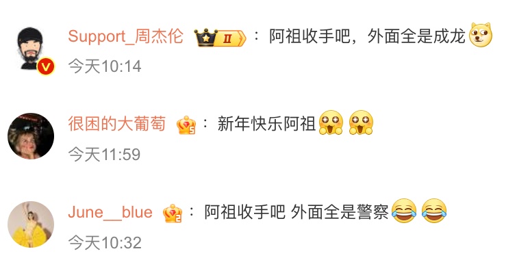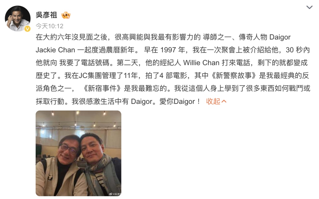 2月1日上午,吴彦祖在微博晒出与成龙大哥的合照并发文表示,六年没见面,很高兴能与最有影响力的导师之一、传奇人物Daigor Jackie Chan 一起度过农历新年。同时还回忆了自己与成龙合作的电影《新警察故事》、《新宿事件》。