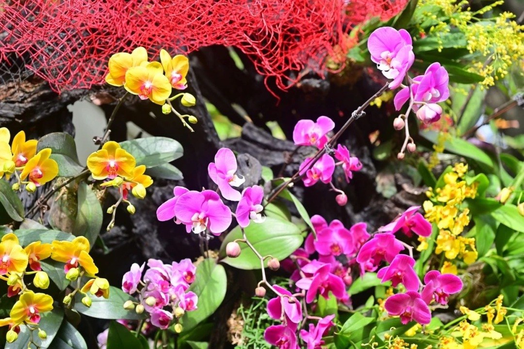 “醉美兰蕨”展区则精心搭配蕨类植物与兰花新优品种,热带雨林般的风光让人沉醉其中。漫步其间,仿佛置身于兰花的梦幻世界。