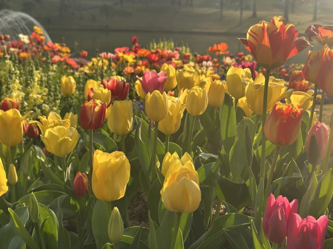 要数数量最多的花海,非白云山云台花园郁金香花海莫属。这里12万株郁金香绚丽绽放,红色、粉色、黄色、紫色、白色……数不尽的色彩,多彩缤纷,让人宛如走进油画中的“莫奈花园”。