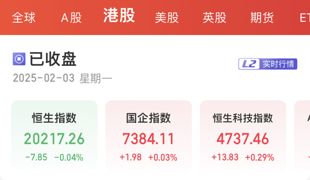 2月3日,中国港股迎来蛇年首个交易日,三大指数探底回升,恒指盘中一度跌逾2%,收盘跌0.04%,收报20217.26点;科技指数盘中一度跌逾3%,收盘涨0.29%,收报4737.46点;国企指数涨0.03%,报7384.11点。