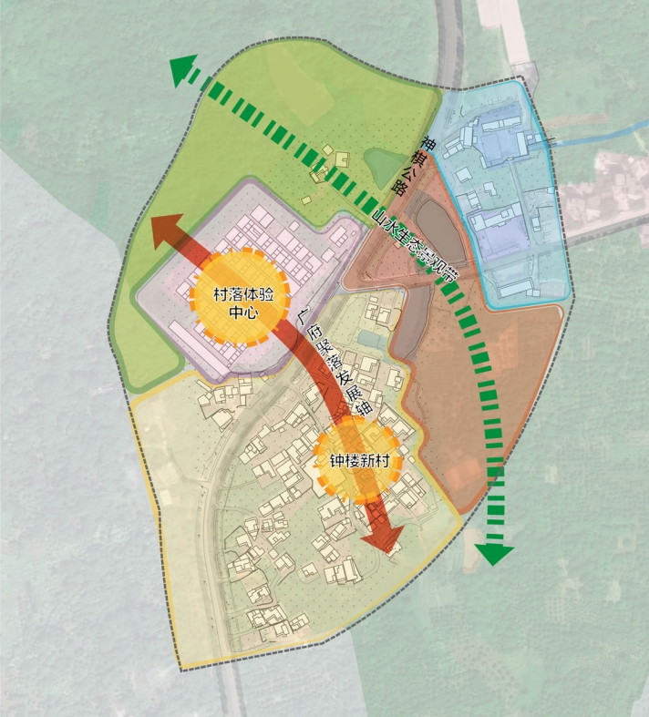 两心:以钟楼古村为主体的传统村落和历史风貌区体验中心及钟楼新村。