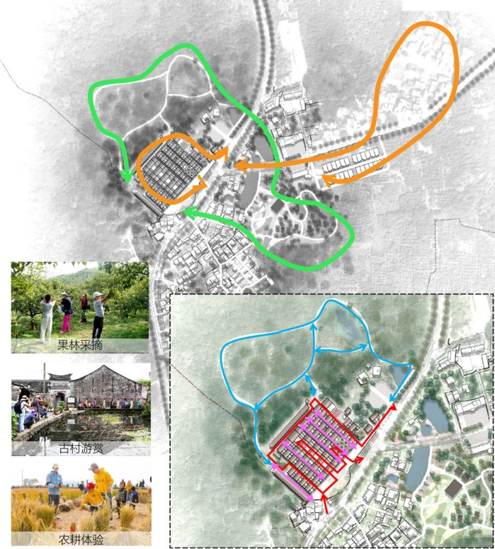 钟楼村周围交通便捷,能够融入从化镇区中心半小时经济生活圈。《规划》将文化与休闲旅游体验相结合,创建“文艺+生态”的文化旅游产业发展模式。通过传统村落和历史风貌区游览主线与自然游赏线的串联,形成三种类型的体验:“农业观光、山林穿越、古村漫游”。围绕三个主题,在钟楼村发展旅游、文化、生活、运动四大功能类型,以文化休闲、餐饮住宿、农耕体验、户外拓展四类项目为主导,打造门户型古村主题园,形成传统文化与休闲农业交融的综合体验。