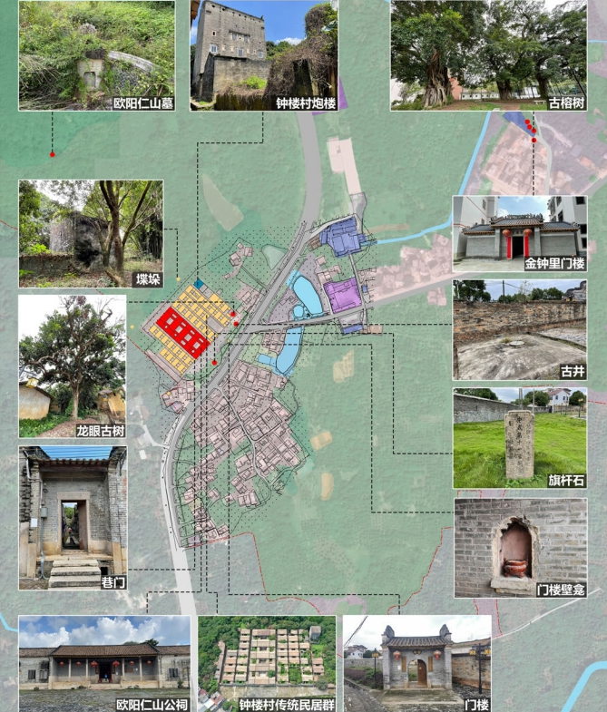 其中,核心保护范围包括欧阳仁山公祠、钟楼村炮楼和钟楼村传统民居群,禾坪、旗杆石、古井、古树等其他历史环境要素,面积为1.33公顷。在核心保护范围内,不得进行新建、扩建活动,新建、扩建必要的基础设施和公共服务设施除外,控制高度不得超过9米。