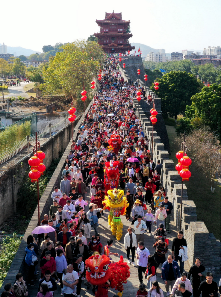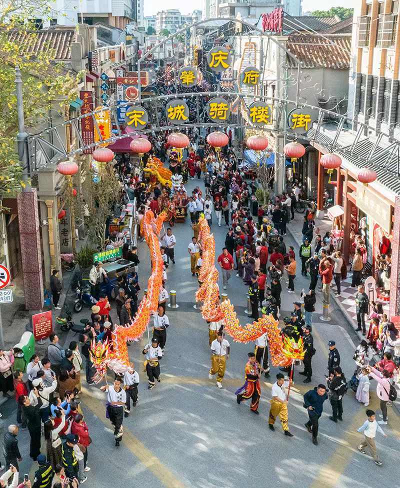 大年初一,宋城骑楼街人声鼎沸,一片欢腾。“府城行大运 龙狮大巡游”民俗活动氛围一片热闹喜庆,为新春文旅活动拉开了序幕。