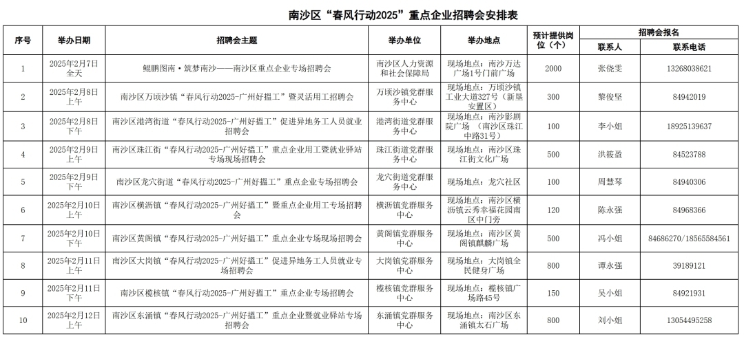 此外,“春风行动”期间,南沙区将高频次举办分类型、分领域的专场招聘活动,并开设线上招聘专区,全面启动线下招聘会,着力畅通供需对接。2月至3月,南沙区计划举办40场线上线下招聘活动,免费为企业及求职者搭建供需对接平台。