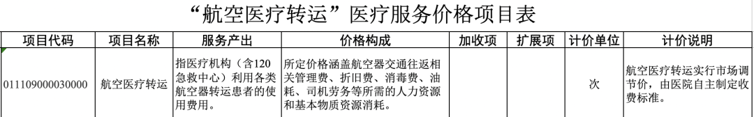 “航空医疗转运”医疗服务价格项目从原市场调节价项目“航空救助”修订而来,服务产出为医疗机构(含120急救中心)利用各类航空器转运患者的使用费用,该项目涵盖了固定翼飞机、直升飞机等各类航空器为患者提供的转运服务,实行市场调节价,由医疗机构自主制定收费标准。医疗机构可根据航空器交通往返相关管理费、折旧费、消毒费、油耗、司机劳务等所需的人力资源和基本物质资源消耗情况自主合理制定收费标准,按价格管理权限报相应医保部门进行价格备案后实施。
