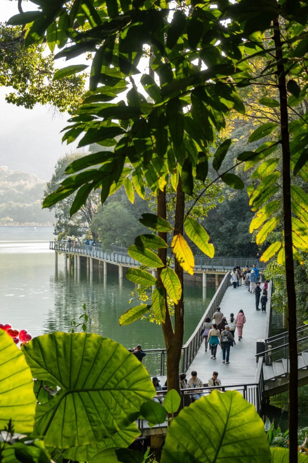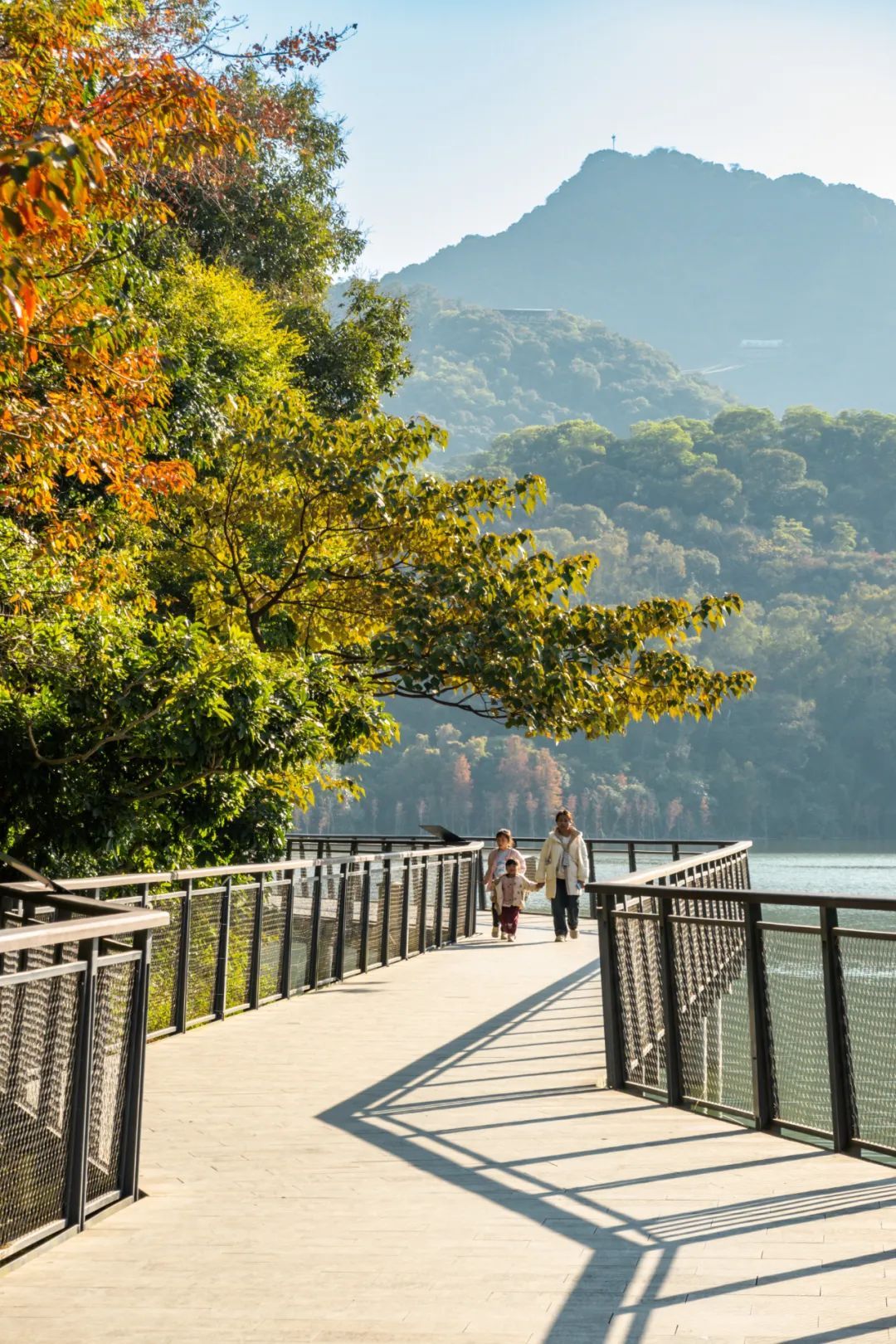 栈道两旁绿树成荫,湖光山色相映成趣,尤其在春秋季节,景色尤为迷人。