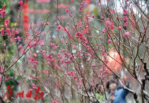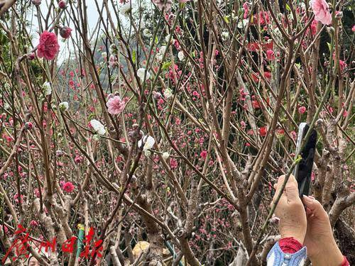 广州白云山桃花涧的桃花迎来盛花期,吸引不少游客驻足拍摄。