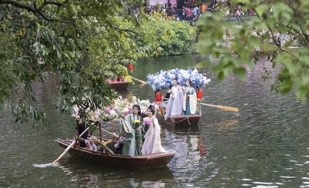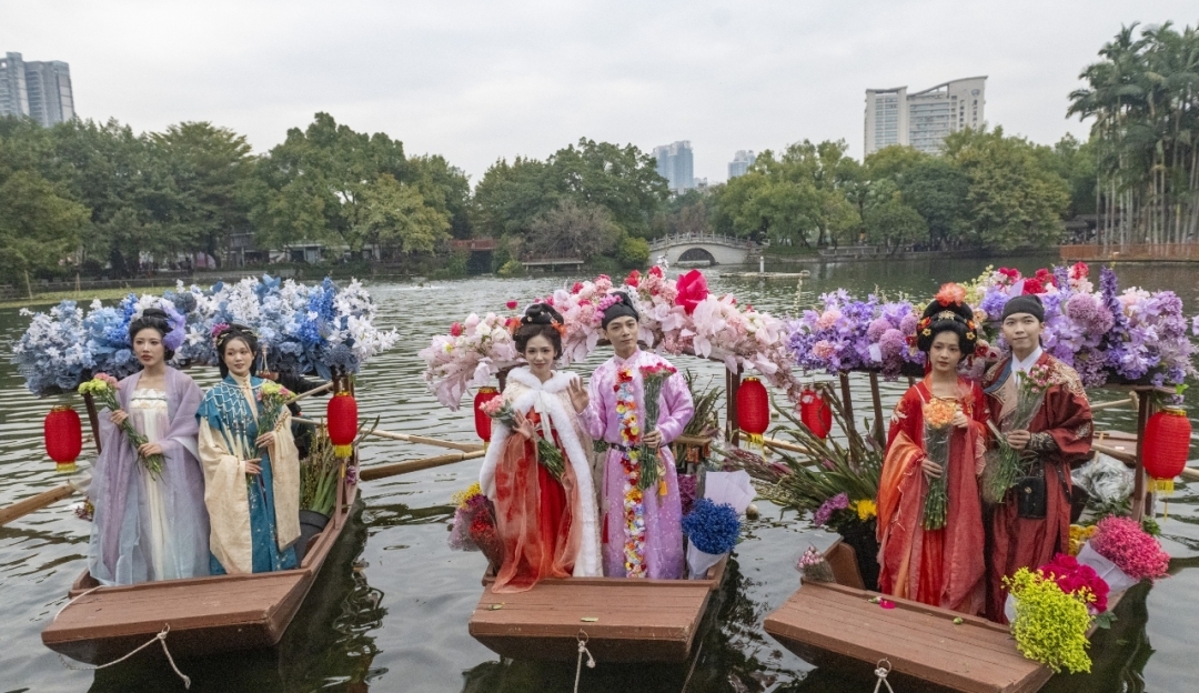 水上繁花映春红。在荔湾湖公园举办水上花市活动,同时全矩阵、多层次、广角度开展宣传,大力提升水上花市活动热度和社会影响力。1月24日,人民日报01版刊登水上花市图片报道。活动期间(1月21至25日),荔湾湖片区游客量总计约为28万人次。