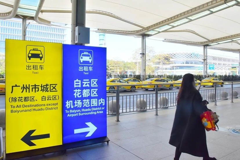地面上,色彩鲜艳、带有清晰箭头的地贴沿着乘客的行进路线蜿蜒伸展,蓝色标识指引前往搭乘白云区、花都区以及机场周边的短途出租车;黄色标识则指引前往搭乘短途以外区域的长途出租车。