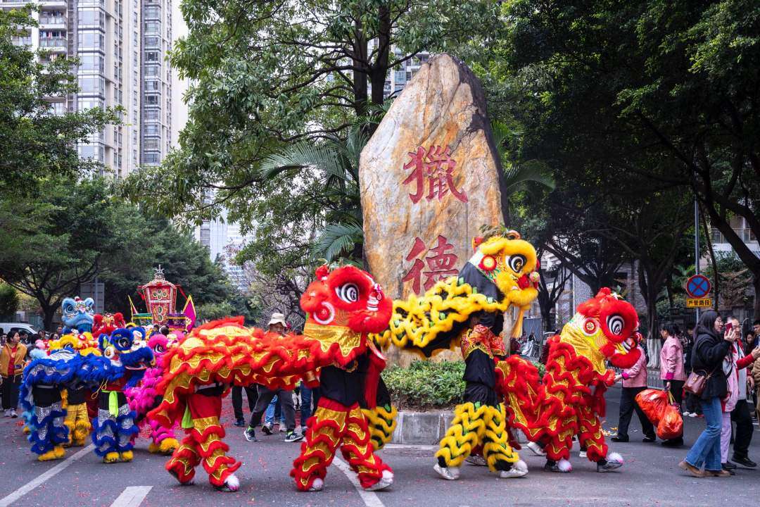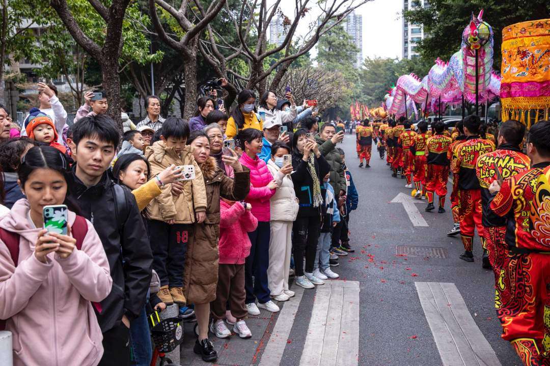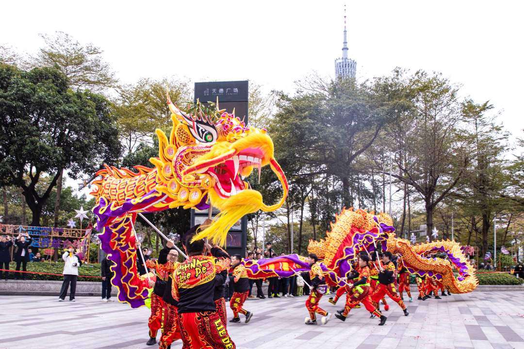 从猎德南牌坊开始,舞龙舞狮、武术、舞蹈、汉服等方阵沿着巡游路线为市民游客献上精彩演出,舞龙巡游、非遗醒狮鼓乐飞扬、太极扇舞动乾坤、猎德鼓振奋人心、汉服展古典之美……传统文化吸引了众多市民游客驻足围观,让国际街区变得热闹非凡。