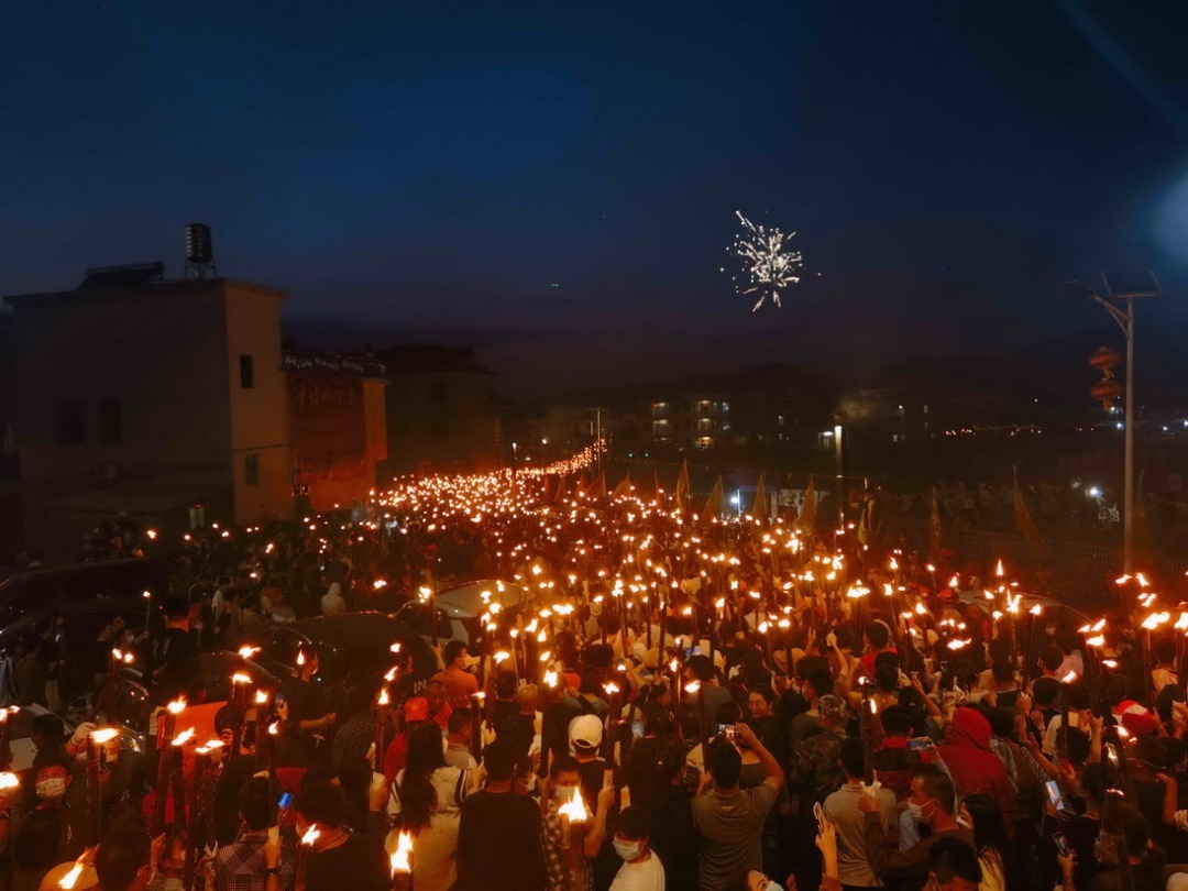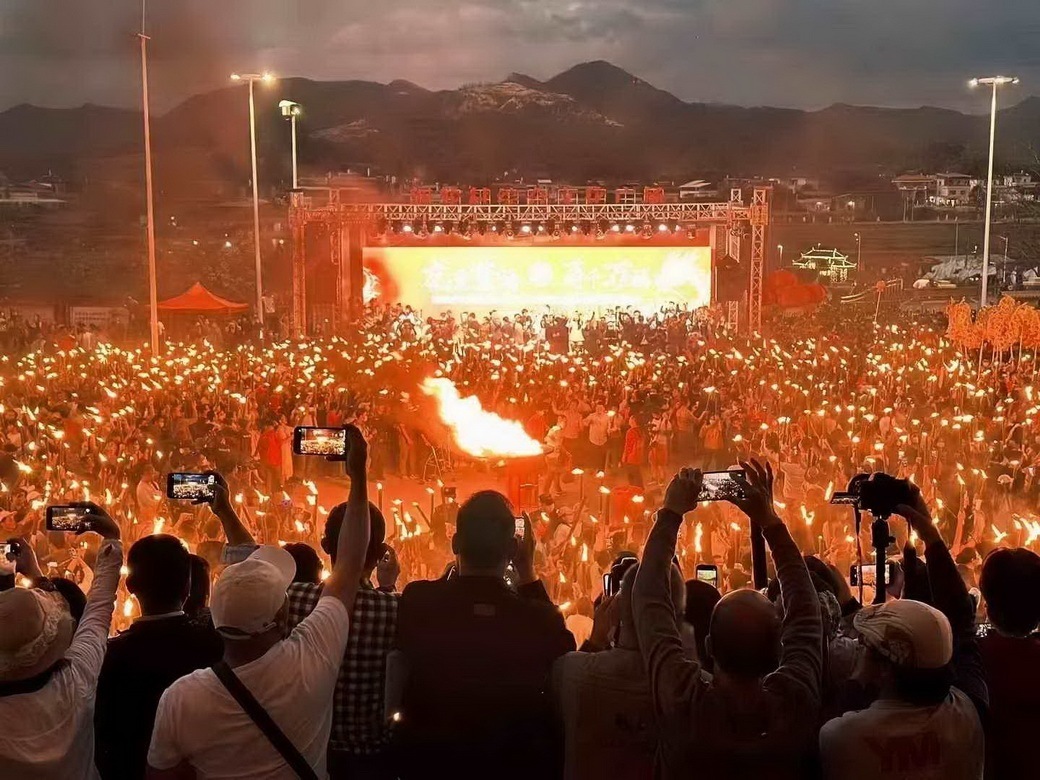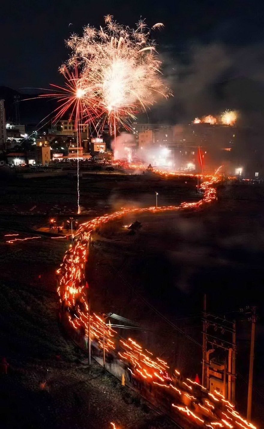 18:00-20:20:“追龙”活动正式开始(烟花秀),众人手持火炬筒跟随舞动的龙狮,“火焰长龙”在乡间流动,烟花绽放,照亮夜空,场面壮观震撼。