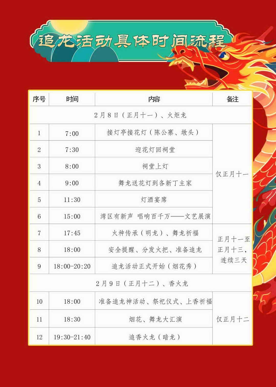 9:00:舞龙送花灯到各新丁主家,龙舞飞扬,花灯闪耀,为新丁主家送去祝福和好运。