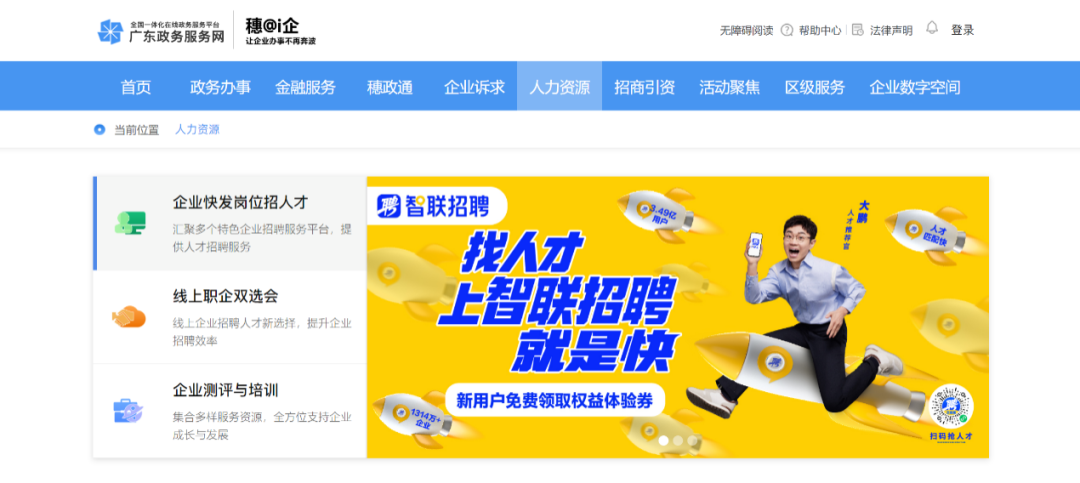 在本次升级中,“穗@i企”平台“人力资源”板块首次引入市场化资源,与智联招聘、易展翅两大知名人力资源机构达成合作,新增多项特色服务,满足企业更多个性化招聘需求。