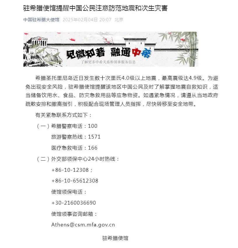 中国驻希腊大使馆发布了相关提醒。网络截图