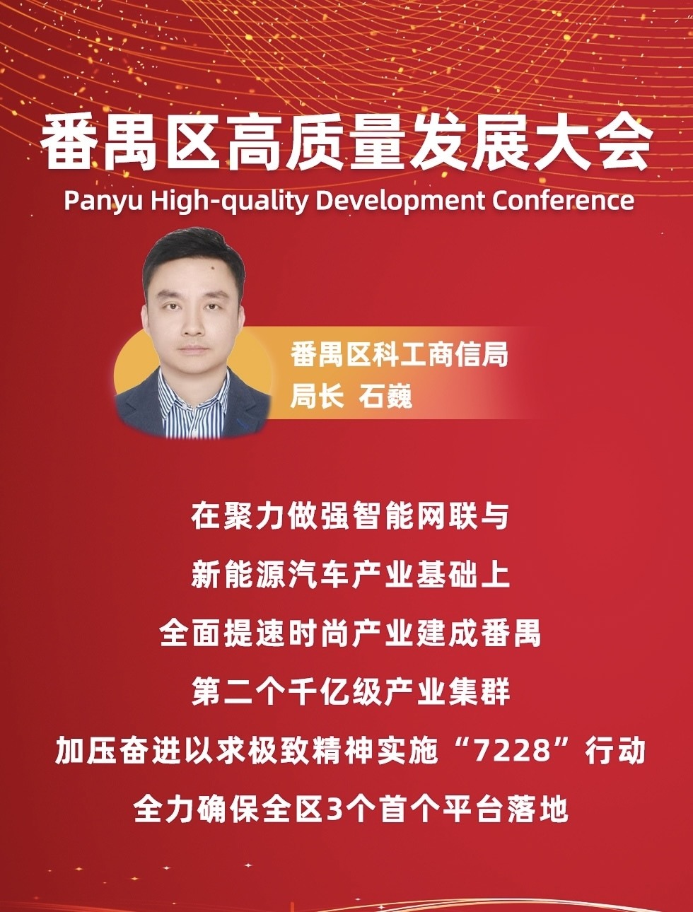 “番禺区高质量发展大会吹响了2025‘来番禺 正当时’的冲锋号,鼓舞人心,催人奋进!”番禺区科工商信局局长石巍在大会上表示,新一年,番禺区科工商信局将牢固树立“主动作为、异军突围、大有可为”的“三为意识”,以“三个大”坚决筑牢产业根基、助力经济发展、捍卫番禺荣誉。