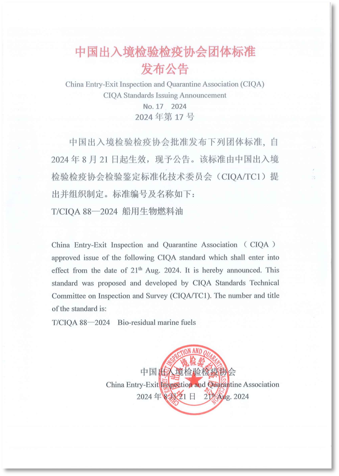 试点企业牵头起草的《船用生物燃料油》团体标准发布