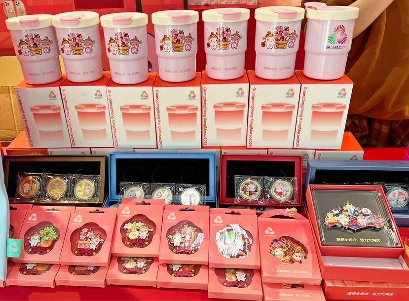 来到白云机场十五运会特许商品展柜前,萌趣盎然的吉祥物“喜洋洋”“乐融融”跃然于文创精品之上。非遗工艺铸就的纪念章流转着大湾区千年文脉,采用广绣技艺的丝巾在光影中演绎岭南水乡的灵动,更有智能温感变色水杯等科技文创,让传统年味碰撞未来想象。特别设计的“湾区竞速”系列徽章套装,以港珠澳大桥、广州塔等湾区地标串联运动元素,成为往来旅客争相收藏的文化信物。