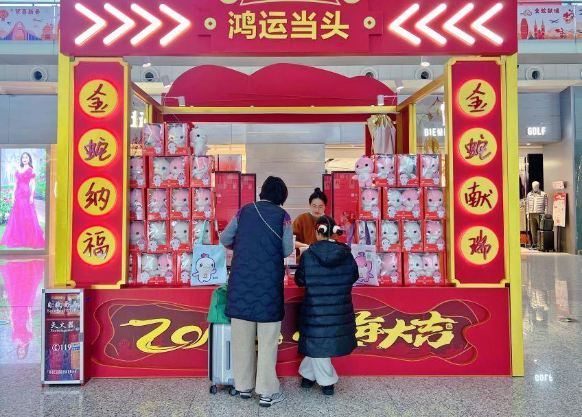 红红的灯笼、喜庆的蛇年展陈、充满广府年俗文化的花街……春运期间的白云机场航站楼一片喜庆祥和。近期十五运会特许商品展柜上架的各类丰富的特许商品,吸引很多过往旅客驻足打卡。