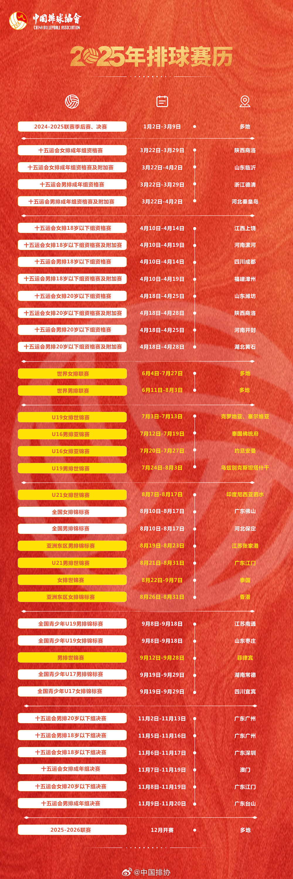 2024-2025赛季中国排球俱乐部超级联赛在春节之后继续举行。根据赛历,男排和女排联赛将于3月上旬全部结束。3月下旬至4月下旬,十五运会排球项目各个年龄组别的预赛在陕西、山东、浙江等多地打响。8月中旬,全国女排锦标赛落户广东佛山,全国男排锦标赛则在河北保定举行。