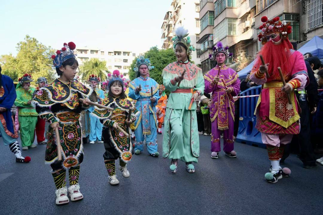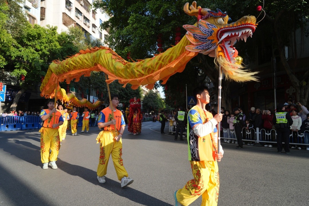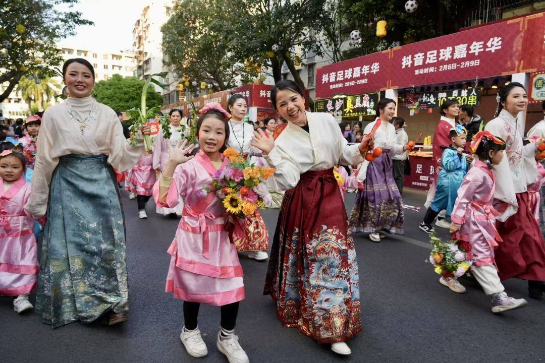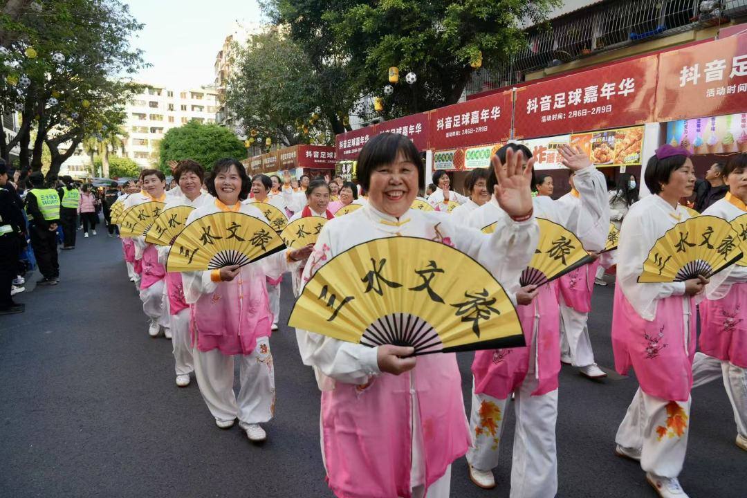 当天下午,球场外已经人山人海,热闹非凡,一场民俗风情浓厚的方阵巡游活动火热开场,醒狮舞龙、英歌舞、国潮少年、粤剧戏曲、红头巾文化、开笔礼、汉服展演、太极扇、旗袍展演、疍家渔歌等特色方阵逐一亮相。