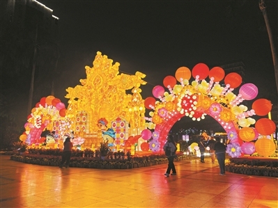 西南广场上以大湾区城市建筑和景观为灵感创作的灯组《璀璨湾区·繁花似锦》,特别采用花瓶造型,上面彩绘了广州、香港、澳门等大湾区城市的地标,头顶红棉、紫荆、荷花等多个花卉造型彩灯,寓意在新的一年大湾区如同花朵般绽放,前程似锦。