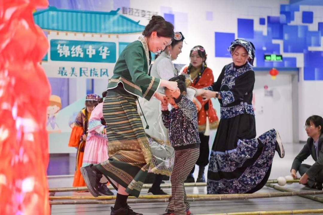 Science instructors, dressed in ethnic minority costumes, lead visitors in a bamboo pole dance in Yinchuan, Ningxia province. [Photo provided to chinadaily.com.cn]